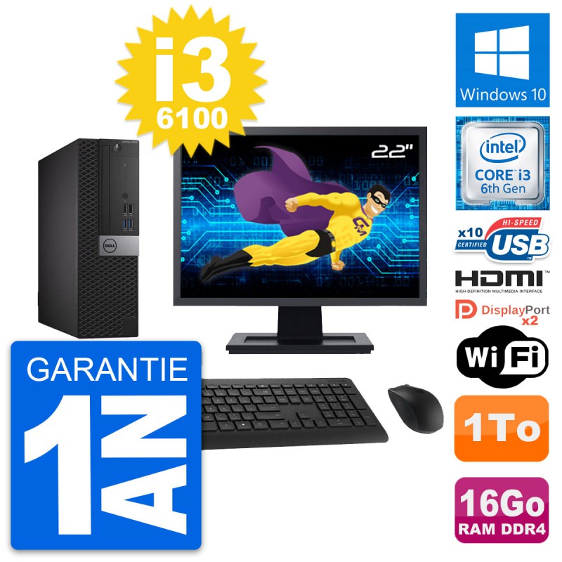 PC Dell OptiPlex 5050 SFF - Intel Core i3-6100 3.7 Ghz (3 Mo) - 16 Go DDR4 - Disque Dur 3,5" 1 To - Clef Wifi USB - HDMI - Windows 10 - Livré avec Ecran 22" + clavier + souris (Marques et modèles variables) - Garantie 1 an.