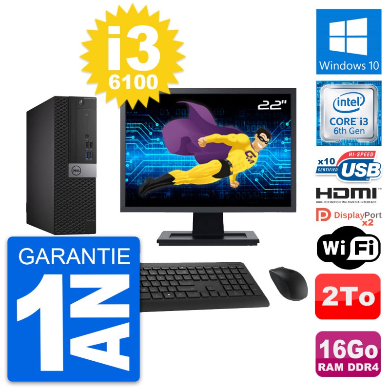 PC Dell OptiPlex 5050 SFF - Intel Core i3-6100 3.7 Ghz (3 Mo) - 16 Go DDR4 - Disque Dur 3,5" 2 To - Clef Wifi USB - HDMI - Windows 10 - Livré avec Ecran 22" + clavier + souris (Marques et modèles variables) - Garantie 1 an.