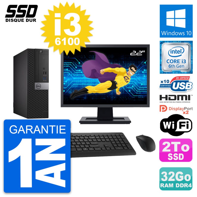 PC Dell OptiPlex 5050 SFF - Intel Core i3-6100 3.7 Ghz (3 Mo) - 32 Go DDR4 - SSD 2 To - Clef Wifi USB - HDMI - Windows 10 - Livré avec Ecran 22" + clavier + souris (Marques et modèles variables) - Garantie 1 an.