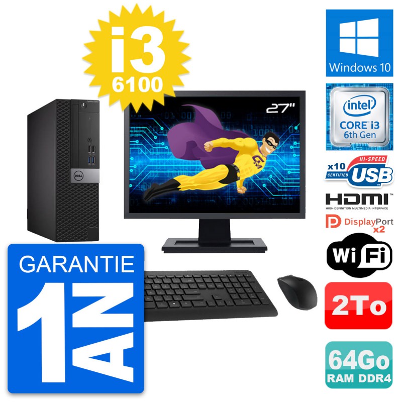 PC Dell OptiPlex 5050 SFF - Intel Core i3-6100 3.7 Ghz (3 Mo) - 64 Go DDR4 - Disque Dur 3,5" 2 To - Clef Wifi USB - HDMI - Windows 10 - Livré avec Ecran 27" + clavier + souris (Marques et modèles variables) - Garantie 1 an.