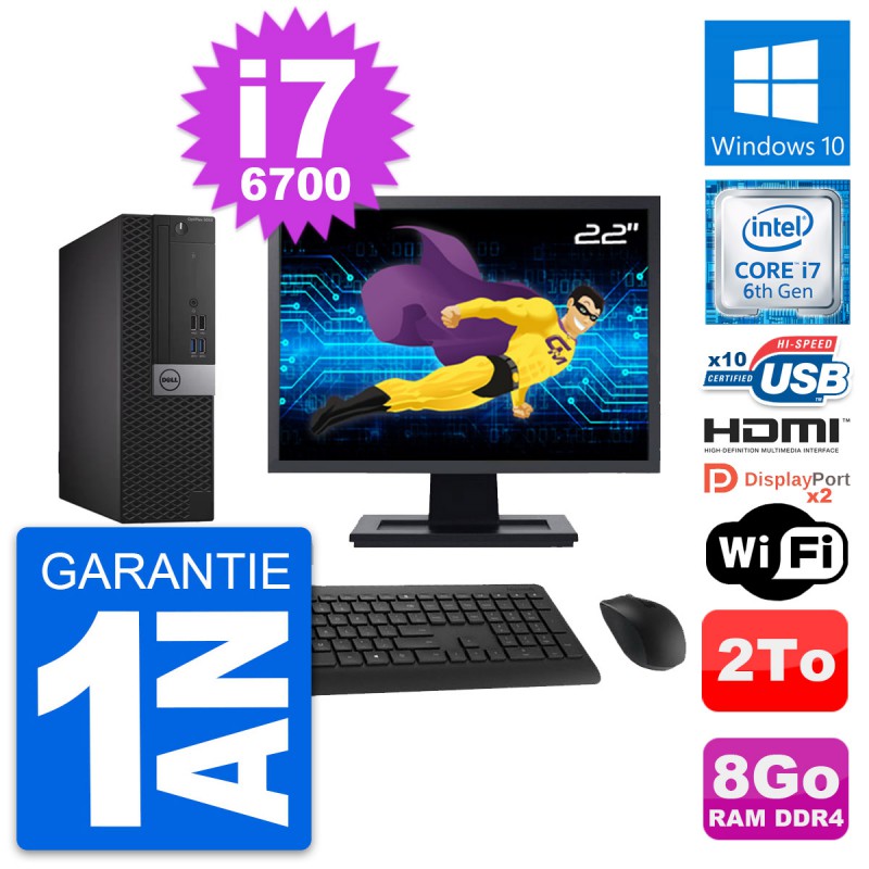 PC Dell OptiPlex 5050 SFF - Intel Core i7-6700 3.4 Ghz (8 Mo) - 8 Go DDR4 - Disque Dur 3,5" 2 To - Clef Wifi USB - HDMI - Windows 10 - Livré avec Ecran 22" + clavier + souris (Marques et modèles variables) - Garantie 1 an.