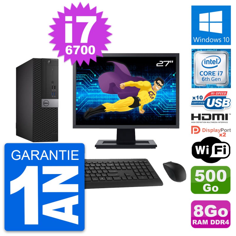 PC Dell OptiPlex 5050 SFF - Intel Core i7-6700 3.4 Ghz (8 Mo) - 8 Go DDR4 - Disque Dur 3,5" 500 Go - Clef Wifi USB - HDMI - Windows 10 - Livré avec Ecran 27" + clavier + souris (Marques et modèles variables) - Garantie 1 an.
