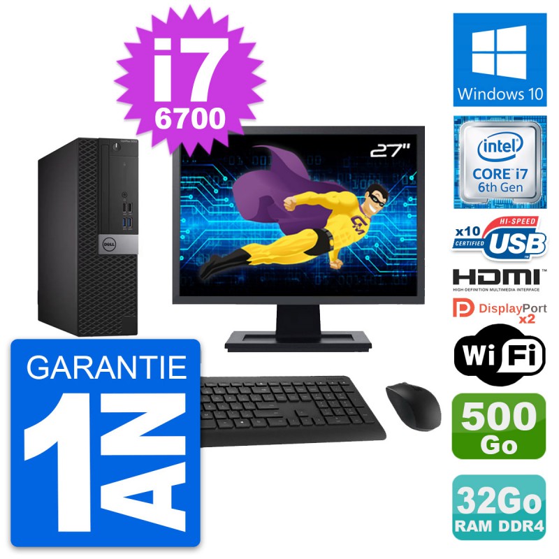 PC Dell OptiPlex 5050 SFF - Intel Core i7-6700 3.4 Ghz (8 Mo) - 32 Go DDR4 - Disque Dur 3,5" 500 Go - Clef Wifi USB - HDMI - Windows 10 - Livré avec Ecran 27" + clavier + souris (Marques et modèles variables) - Garantie 1 an.