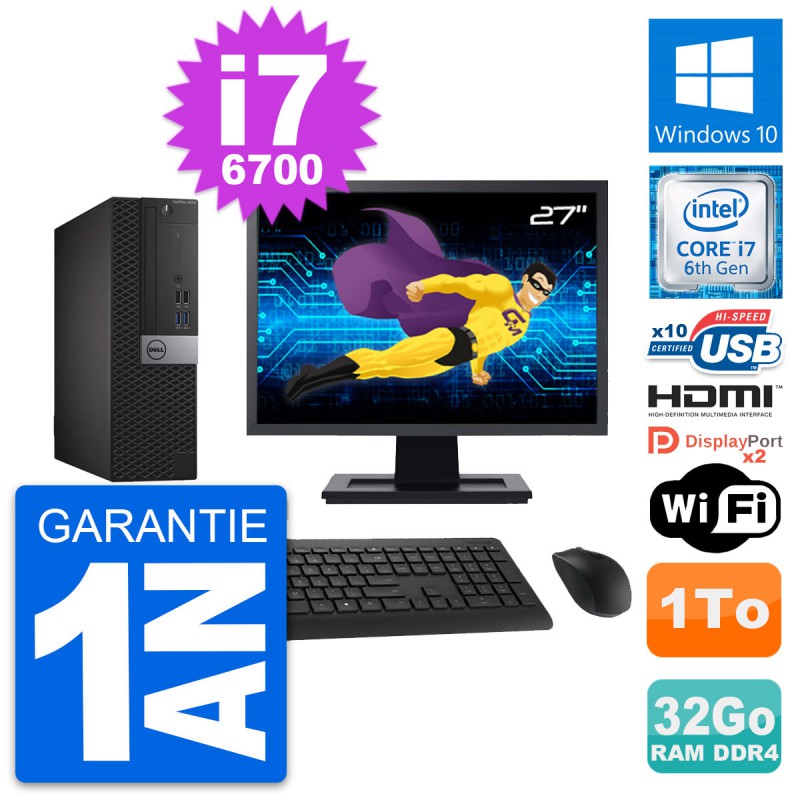 PC Dell OptiPlex 5050 SFF - Intel Core i7-6700 3.4 Ghz (8 Mo) - 32 Go DDR4 - Disque Dur 3,5" 1 To - Clef Wifi USB - HDMI - Windows 10 - Livré avec Ecran 27" + clavier + souris (Marques et modèles variables) - Garantie 1 an.