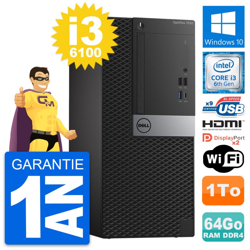 PC Tour Dell OptiPlex 7050 MT - Intel Core i3-6100 3.7 Ghz (3 Mo) - 64 Go DDR4 - Disque Dur 3,5" 1 To - Clef Wifi USB - Windows 10 - Garantie 1 an.