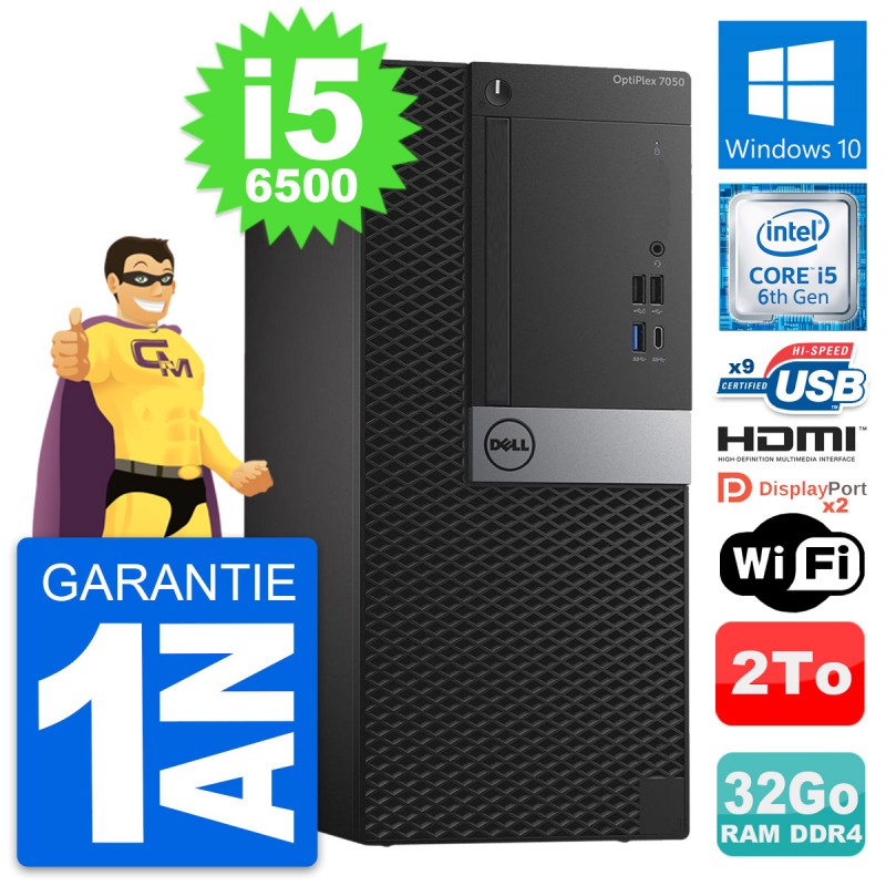PC Tour Dell OptiPlex 7050 MT - Intel Core i5-6500 3.2 Ghz (6 Mo) - 32 Go DDR4 - Disque Dur 3,5" 2 To - Clef Wifi USB - Windows 10 - Garantie 1 an.