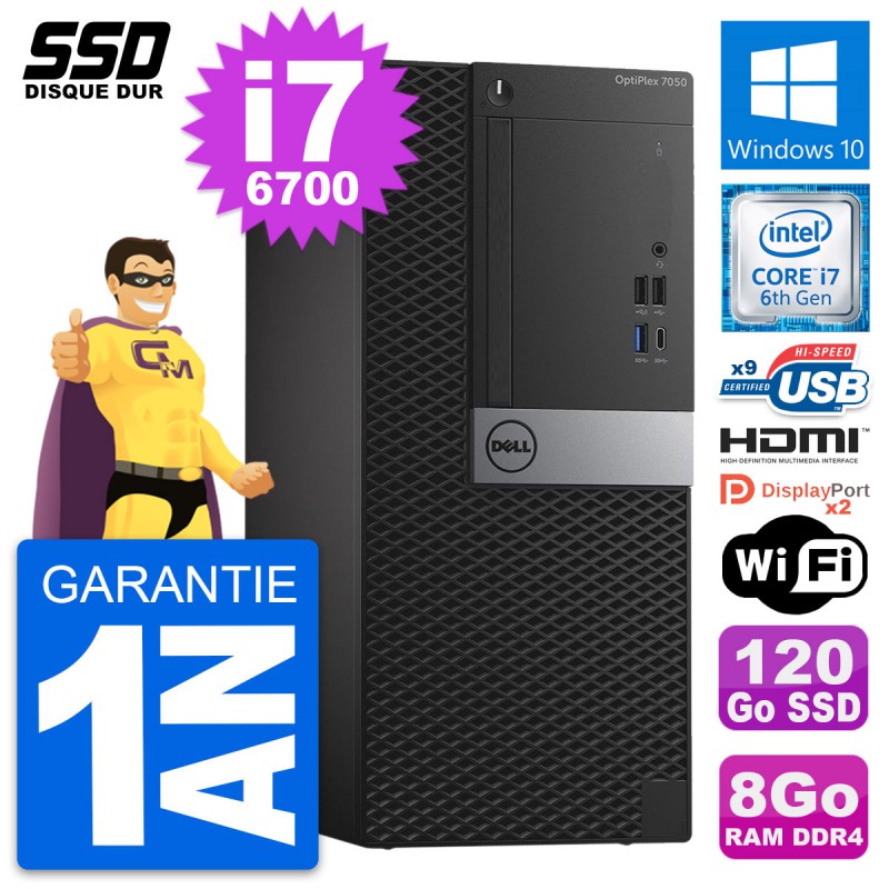 PC Tour Dell OptiPlex 7050 MT - Intel Core i7-6700 3.4 Ghz (8 Mo) - 8 Go DDR4 - SSD 120 Go - Clef Wifi USB - Windows 10 - Garantie 1 an.