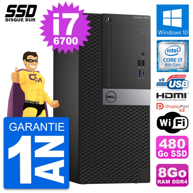 PC Tour Dell OptiPlex 7050 MT - Intel Core i7-6700 3.4 Ghz (8 Mo) - 8 Go DDR4 - SSD 480 Go - Clef Wifi USB - Windows 10 - Garantie 1 an.