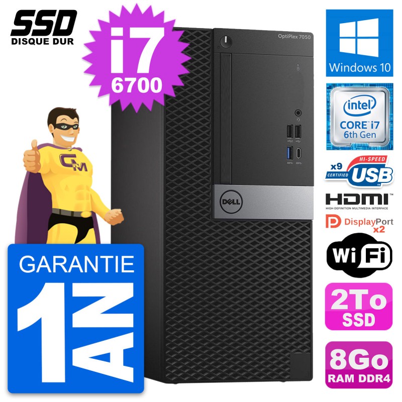 PC Tour Dell OptiPlex 7050 MT - Intel Core i7-6700 3.4 Ghz (8 Mo) - 8 Go DDR4 - SSD 2 To - Clef Wifi USB - Windows 10 - Garantie 1 an.