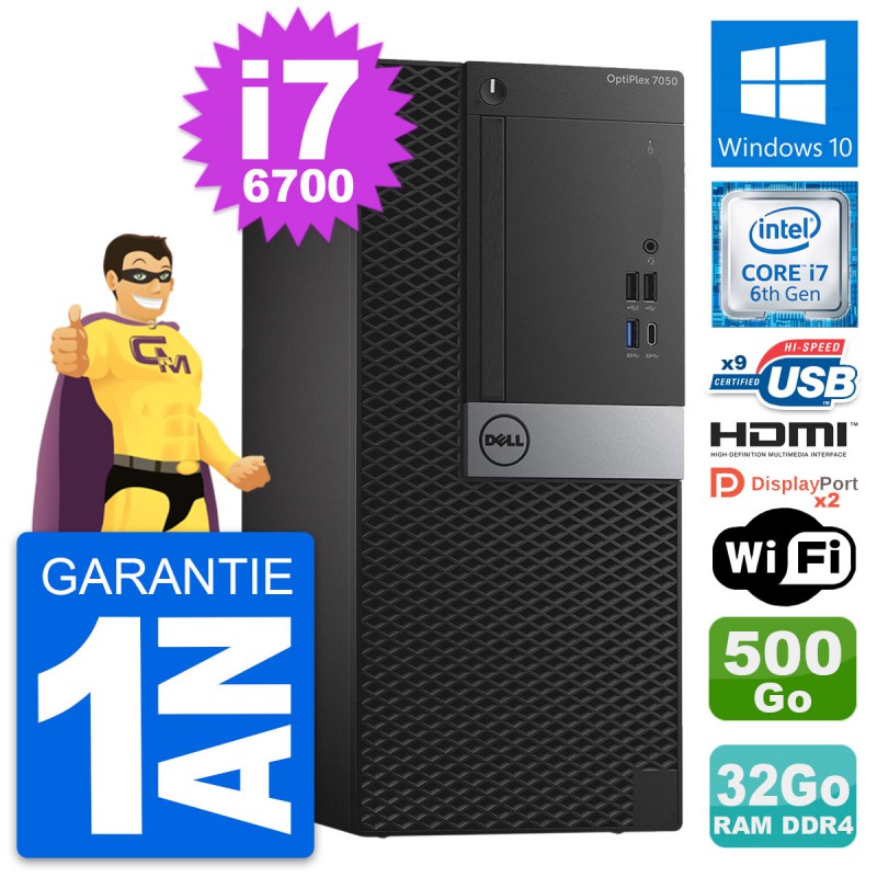 PC Tour Dell OptiPlex 7050 MT - Intel Core i7-6700 3.4 Ghz (8 Mo) - 32 Go DDR4 - Disque Dur 3,5" 500 Go - Clef Wifi USB - Windows 10 - Garantie 1 an.