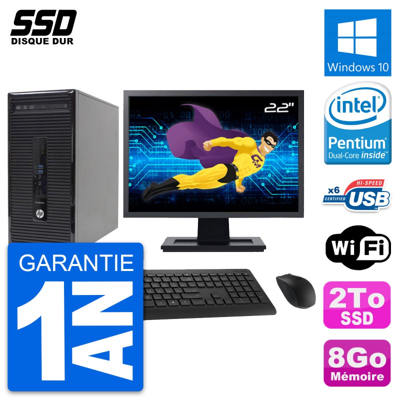 PC Tour HP ProDesk 400 G2 MT - Intel Pentium Dual-Core G3220 3.0 Ghz (3 Mo) - 8 Go DDR3 - SSD 2 To - Graveur DVD - Clef Wifi USB - Windows 10 - Livré avec Ecran 22" + clavier + souris (Marques et modèles variables) - Garantie 1 an.