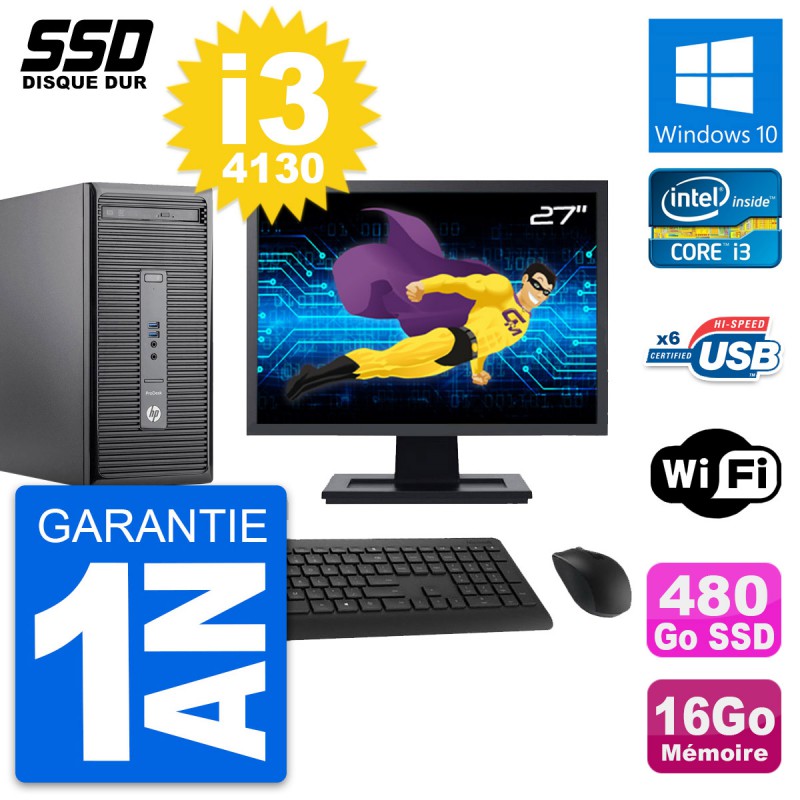 PC Tour HP 400 G2 MT Ecran 27" Core i3-4130 RAM 16Go SSD 480Go Windows 10 Wifi