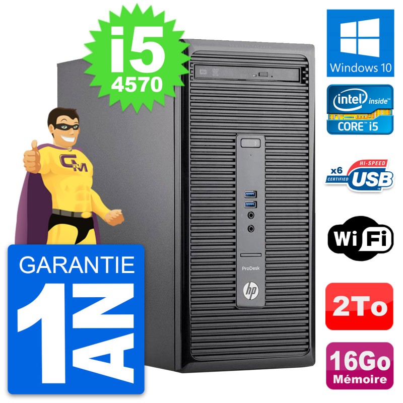 PC Tour HP ProDesk 400 G2 MT - Intel Core i5-4570 3.2 Ghz (6 Mo) - 16 Go DDR3 - Disque Dur 3,5" 2 To - Graveur DVD - Clef Wifi USB - Windows 10 - Garantie 1 an.