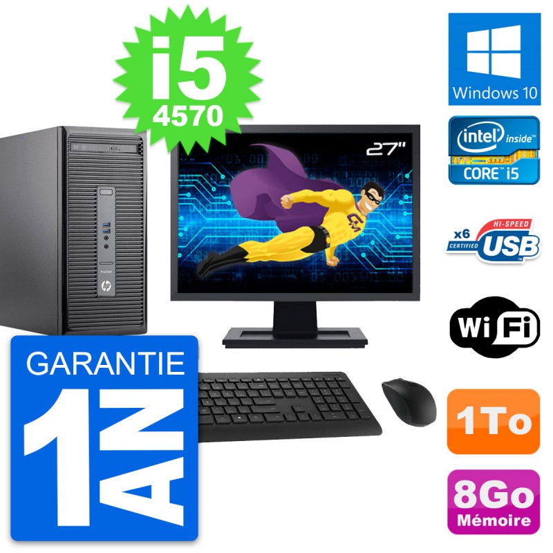 PC Tour HP ProDesk 400 G2 MT - Intel Core i5-4570 3.2 Ghz (6 Mo) - 8 Go DDR3 - Disque Dur 3,5" 1 To - Graveur DVD - Clef Wifi USB - Windows 10 - Livré avec Ecran 27" + clavier + souris (Marques et modèles variables) - Garantie 1 an.