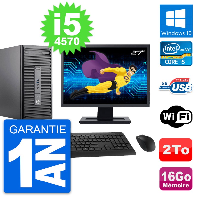PC Tour HP ProDesk 400 G2 MT - Intel Core i5-4570 3.2 Ghz (6 Mo) - 16 Go DDR3 - Disque Dur 3,5" 2 To - Graveur DVD - Clef Wifi USB - Windows 10 - Livré avec Ecran 27" + clavier + souris (Marques et modèles variables) - Garantie 1 an.