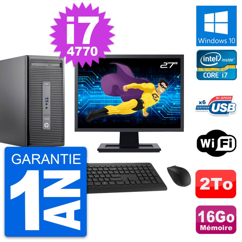 PC Tour HP ProDesk 400 G2 MT - Intel Core i7-4770 3.4 Ghz (8 Mo) - 16 Go DDR3 - Disque Dur 3,5" 2 To - Graveur DVD - Clef Wifi USB - Windows 10 - Livré avec Ecran 27" + clavier + souris (Marques et modèles variables) - Garantie 1 an.
