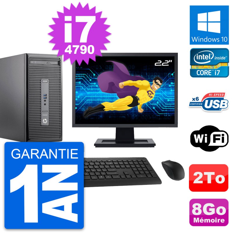 PC Tour HP ProDesk 400 G2 MT - Intel Core i7-4790 3.6 Ghz (8 Mo) - 8 Go DDR3 - Disque Dur 3,5" 2 To - Graveur DVD - Clef Wifi USB - Windows 10 - Livré avec Ecran 22" + clavier + souris (Marques et modèles variables) - Garantie 1 an.