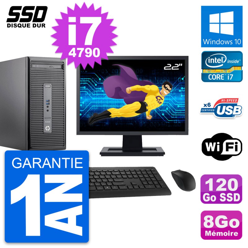 PC Tour HP ProDesk 400 G2 MT - Intel Core i7-4790 3.6 Ghz (8 Mo) - 8 Go DDR3 - SSD 120 Go - Graveur DVD - Clef Wifi USB - Windows 10 - Livré avec Ecran 22" + clavier + souris (Marques et modèles variables) - Garantie 1 an.