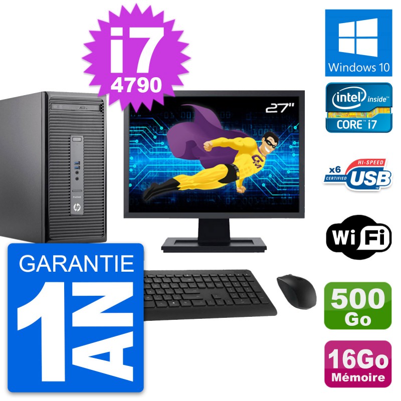 PC Tour HP ProDesk 400 G2 MT - Intel Core i7-4790 3.6 Ghz (8 Mo) - 16 Go DDR3 - Disque Dur 3,5" 500 Go - Graveur DVD - Clef Wifi USB - Windows 10 - Livré avec Ecran 27" + clavier + souris (Marques et modèles variables) - Garantie 1 an.