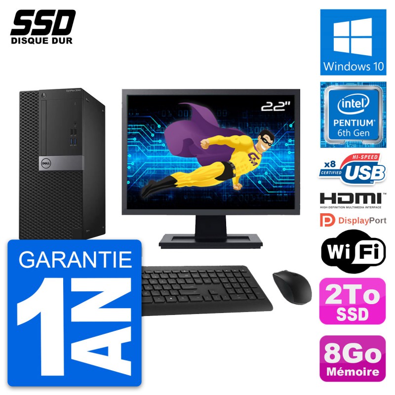 PC Tour Dell OptiPlex 3040 MT - Intel Pentium Dual-Core G4400 3.3 Ghz (3 Mo) - 8 Go DDR3L - SSD 2 To - Clef Wifi USB - Windows 10 - Livré avec Ecran 22" + clavier + souris (Marques et modèles variables) - Garantie 1 an.