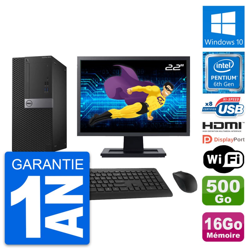 PC Tour Dell OptiPlex 3040 MT - Intel Pentium Dual-Core G4400 3.3 Ghz (3 Mo) - 16 Go DDR3L - Disque Dur 3,5" 500 Go - Clef Wifi USB - Windows 10 - Livré avec Ecran 22" + clavier + souris (Marques et modèles variables) - Garantie 1 an.