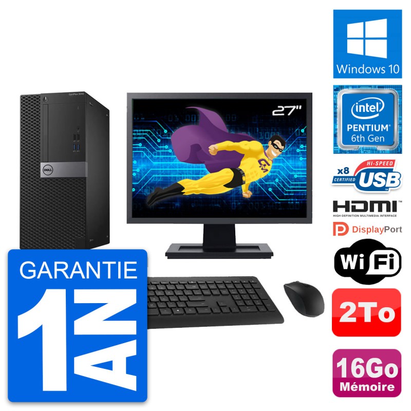PC Tour Dell OptiPlex 3040 MT - Intel Pentium Dual-Core G4400 3.3 Ghz (3 Mo) - 16 Go DDR3L - Disque Dur 3,5" 2 To - Clef Wifi USB - Windows 10 - Livré avec Ecran 27" + clavier + souris (Marques et modèles variables) - Garantie 1 an.
