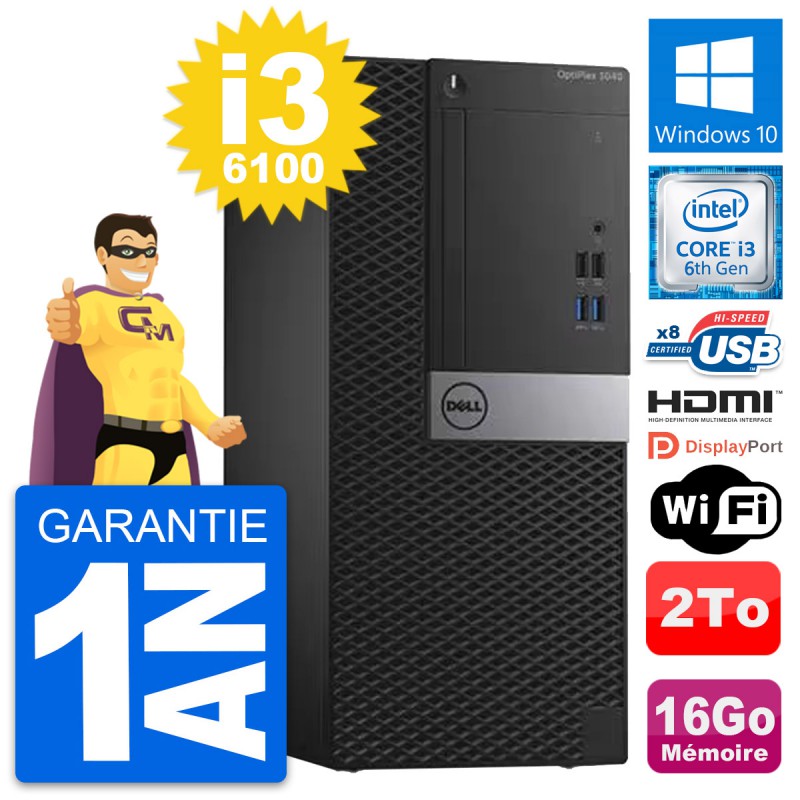 PC Tour Dell OptiPlex 3040 MT - Intel Core i3-6100 3.7 Ghz (3 Mo) - 16 Go DDR3L - Disque Dur 3,5" 2 To - Clef Wifi USB - Windows 10 - Garantie 1 an.