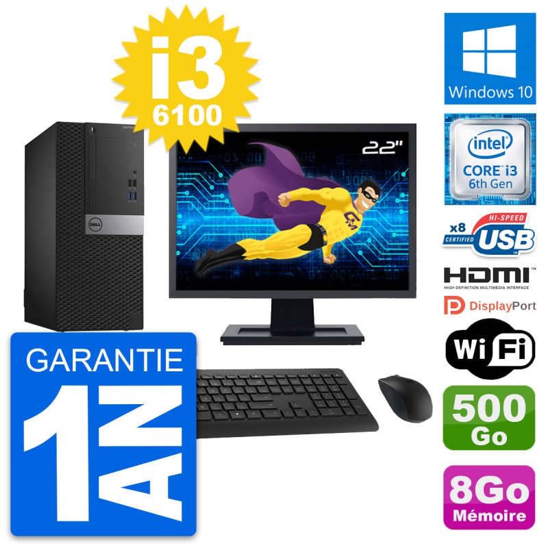 PC Tour Dell OptiPlex 3040 MT - Intel Core i3-6100 3.7 Ghz (3 Mo) - 8 Go DDR3L - Disque Dur 3,5" 500 Go - Clef Wifi USB - Windows 10 - Livré avec Ecran 22" + clavier + souris (Marques et modèles variables) - Garantie 1 an.