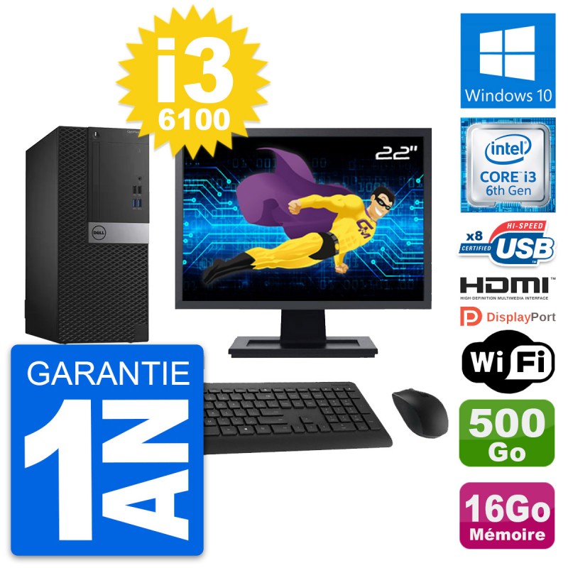 PC Tour Dell OptiPlex 3040 MT - Intel Core i3-6100 3.7 Ghz (3 Mo) - 16 Go DDR3L - Disque Dur 3,5" 500 Go - Clef Wifi USB - Windows 10 - Livré avec Ecran 22" + clavier + souris (Marques et modèles variables) - Garantie 1 an.