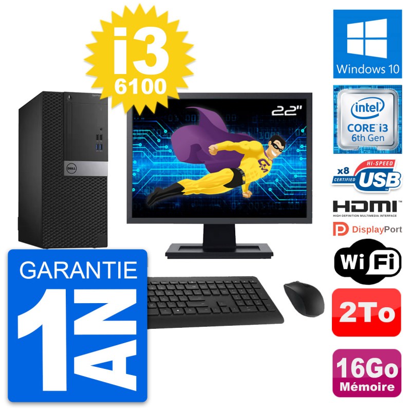 PC Tour Dell OptiPlex 3040 MT - Intel Core i3-6100 3.7 Ghz (3 Mo) - 16 Go DDR3L - Disque Dur 3,5" 2 To - Clef Wifi USB - Windows 10 - Livré avec Ecran 22" + clavier + souris (Marques et modèles variables) - Garantie 1 an.