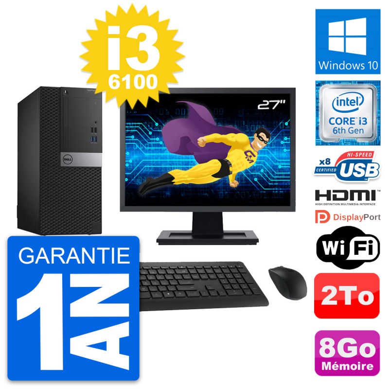 PC Tour Dell OptiPlex 3040 MT - Intel Core i3-6100 3.7 Ghz (3 Mo) - 8 Go DDR3L - Disque Dur 3,5" 2 To - Clef Wifi USB - Windows 10 - Livré avec Ecran 27" + clavier + souris (Marques et modèles variables) - Garantie 1 an.