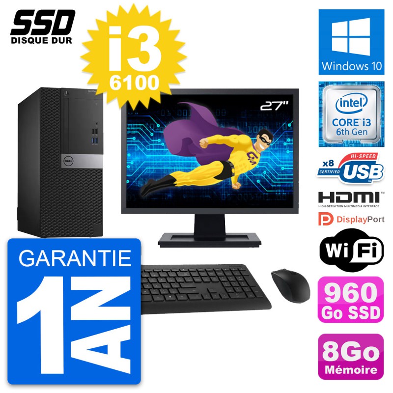 PC Tour Dell OptiPlex 3040 MT - Intel Core i3-6100 3.7 Ghz (3 Mo) - 8 Go DDR3L - SSD 960 Go - Clef Wifi USB - Windows 10 - Livré avec Ecran 27" + clavier + souris (Marques et modèles variables) - Garantie 1 an.