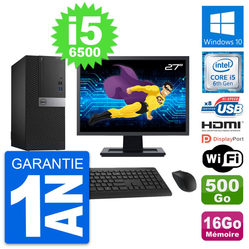 PC Tour Dell OptiPlex 3040 MT - Intel Core i5-6500 3.2 Ghz (6 Mo) - 16 Go DDR3L - Disque Dur 3,5" 500 Go - Clef Wifi USB - Windows 10 - Livré avec Ecran 27" + clavier + souris (Marques et modèles variables) - Garantie 1 an.