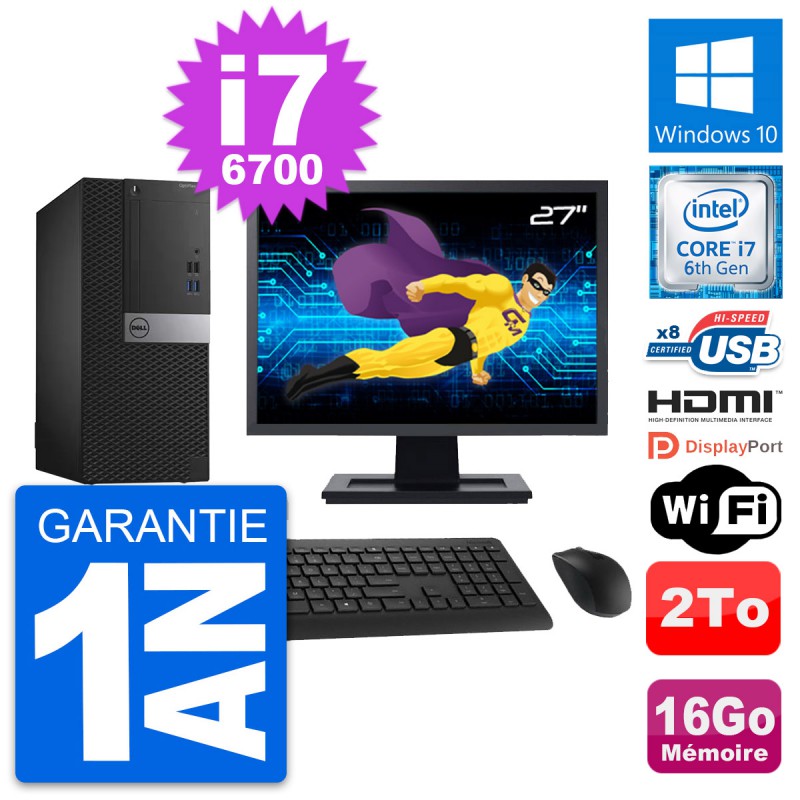 PC Tour Dell OptiPlex 3040 MT - Intel Core i7-6700 3.4 Ghz (8 Mo) - 16 Go DDR3L - Disque Dur 3,5" 2 To - Clef Wifi USB - Windows 10 - Livré avec Ecran 27" + clavier + souris (Marques et modèles variables) - Garantie 1 an.