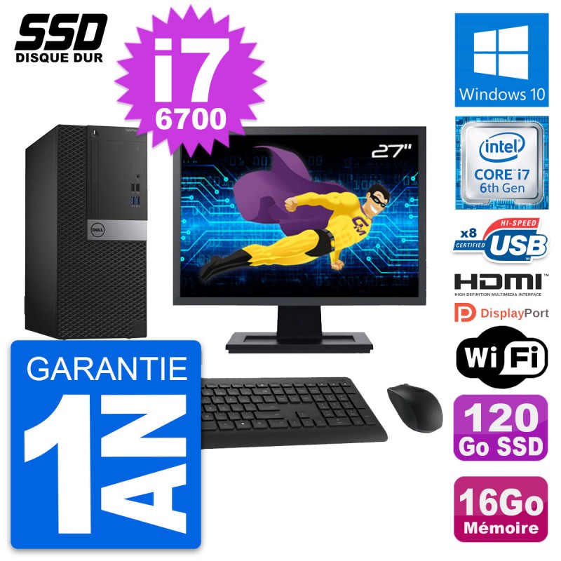 PC Tour Dell OptiPlex 3040 MT - Intel Core i7-6700 3.4 Ghz (8 Mo) - 16 Go DDR3L - SSD 120 Go - Clef Wifi USB - Windows 10 - Livré avec Ecran 27" + clavier + souris (Marques et modèles variables) - Garantie 1 an.