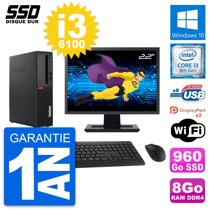 PC Lenovo ThinkCentre M910s SFF - Intel Core i3-6100 3.7 Ghz (3 Mo) - 8 Go DDR4 - SSD 960 Go - Clef Wifi USB - Windows 10 - Livré avec Ecran 22" + clavier + souris (Marques et modèles variables) - Garantie 1 an.