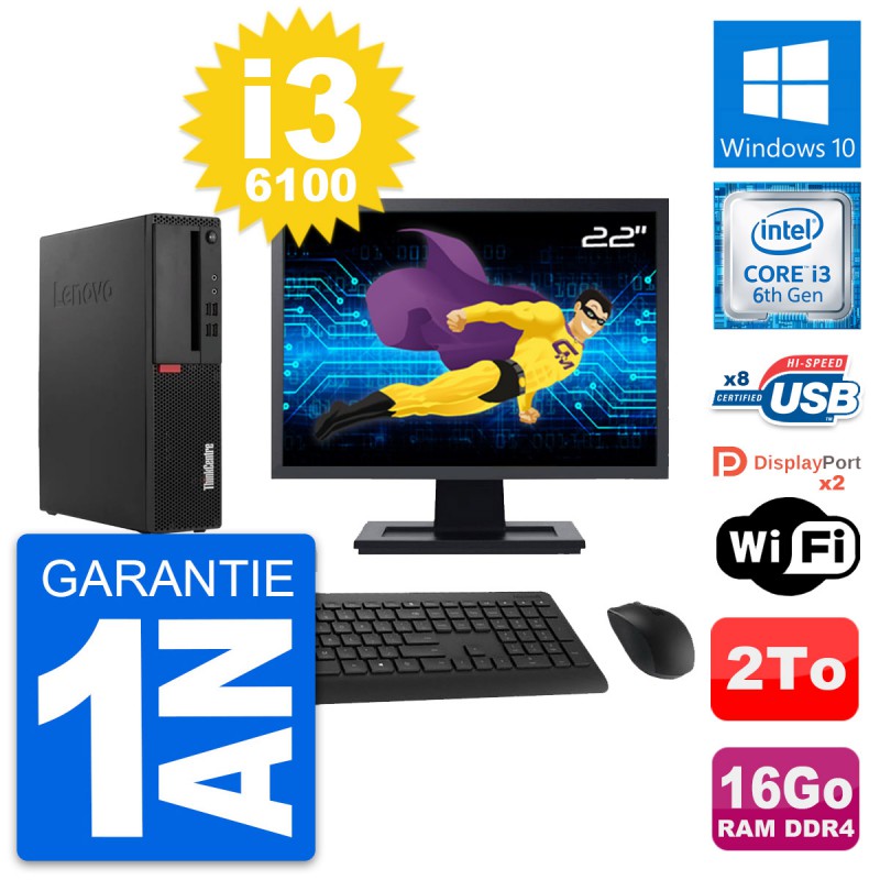 PC Lenovo ThinkCentre M910s SFF - Intel Core i3-6100 3.7 Ghz (3 Mo) - 16 Go DDR4 - Disque Dur 3,5" 2 To - Clef Wifi USB - Windows 10 - Livré avec Ecran 22" + clavier + souris (Marques et modèles variables) - Garantie 1 an.