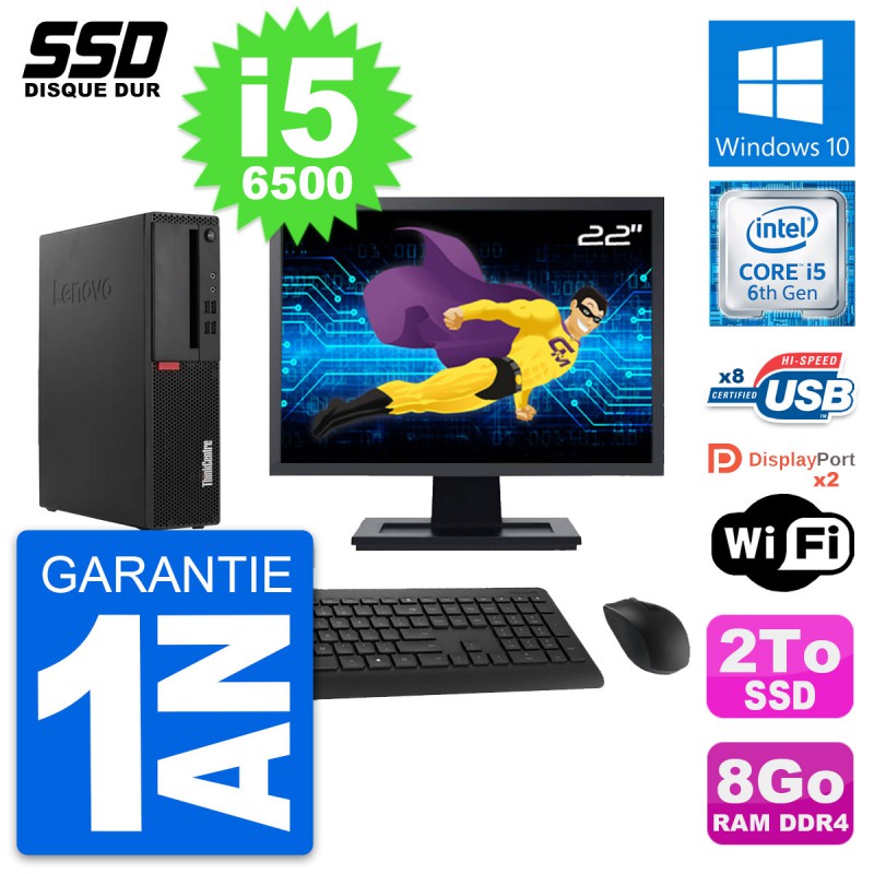 PC Lenovo ThinkCentre M910s SFF - Intel Core i5-6500 3.2 Ghz (6 Mo) - 8 Go DDR4 - SSD 2 To - Clef Wifi USB - Windows 10 - Livré avec Ecran 22" + clavier + souris (Marques et modèles variables) - Garantie 1 an.