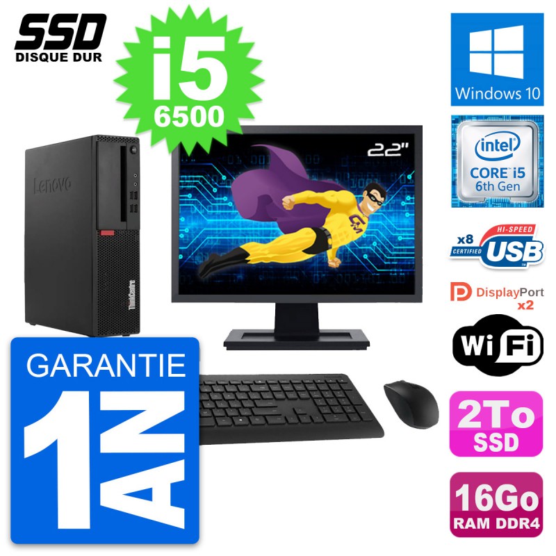 PC Lenovo ThinkCentre M910s SFF - Intel Core i5-6500 3.2 Ghz (6 Mo) - 16 Go DDR4 - SSD 2 To - Clef Wifi USB - Windows 10 - Livré avec Ecran 22" + clavier + souris (Marques et modèles variables) - Garantie 1 an.