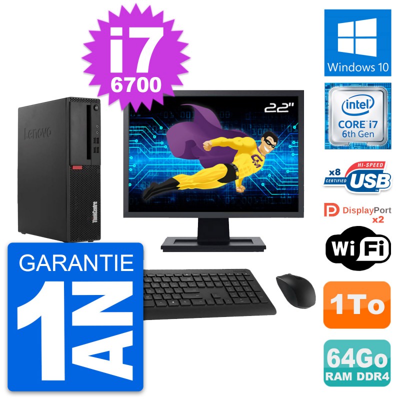 PC Lenovo ThinkCentre M910s SFF - Intel Core i7-6700 3.4 Ghz (8 Mo) - 64 Go DDR4 - Disque Dur 3,5" 1 To - Clef Wifi USB - Windows 10 - Livré avec Ecran 22" + clavier + souris (Marques et modèles variables) - Garantie 1 an.