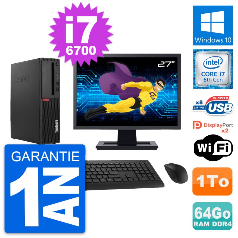 PC Lenovo ThinkCentre M910s SFF - Intel Core i7-6700 3.4 Ghz (8 Mo) - 64 Go DDR4 - Disque Dur 3,5" 1 To - Clef Wifi USB - Windows 10 - Livré avec Ecran 27" + clavier + souris (Marques et modèles variables) - Garantie 1 an.