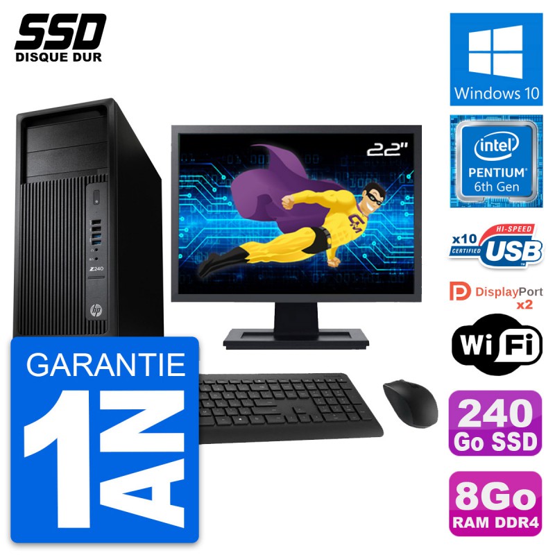 PC Tour HP WorkStation Z240 MT - Intel Pentium Dual-Core G4400 3.3 Ghz (3 Mo) - 8 Go DDR4 - SSD 240 Go - Clef Wifi USB - Windows 10 - Livré avec Ecran 22" + clavier + souris (Marques et modèles variables) - Garantie 1 an.