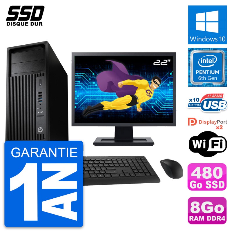 PC Tour HP WorkStation Z240 MT - Intel Pentium Dual-Core G4400 3.3 Ghz (3 Mo) - 8 Go DDR4 - SSD 480 Go - Clef Wifi USB - Windows 10 - Livré avec Ecran 22" + clavier + souris (Marques et modèles variables) - Garantie 1 an.