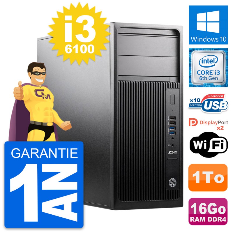 PC Tour HP WorkStation Z240 MT - Intel Core i3-6100 3.7 Ghz (3 Mo) - 16 Go DDR4 - Disque Dur 3,5" 1 To - Clef Wifi USB - Windows 10 - Garantie 1 an.