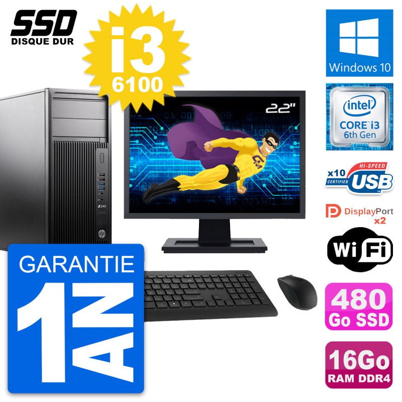 PC Tour HP WorkStation Z240 MT - Intel Core i3-6100 3.7 Ghz (3 Mo) - 16 Go DDR4 - SSD 480 Go - Clef Wifi USB - Windows 10 - Livré avec Ecran 22" + clavier + souris (Marques et modèles variables) - Garantie 1 an.