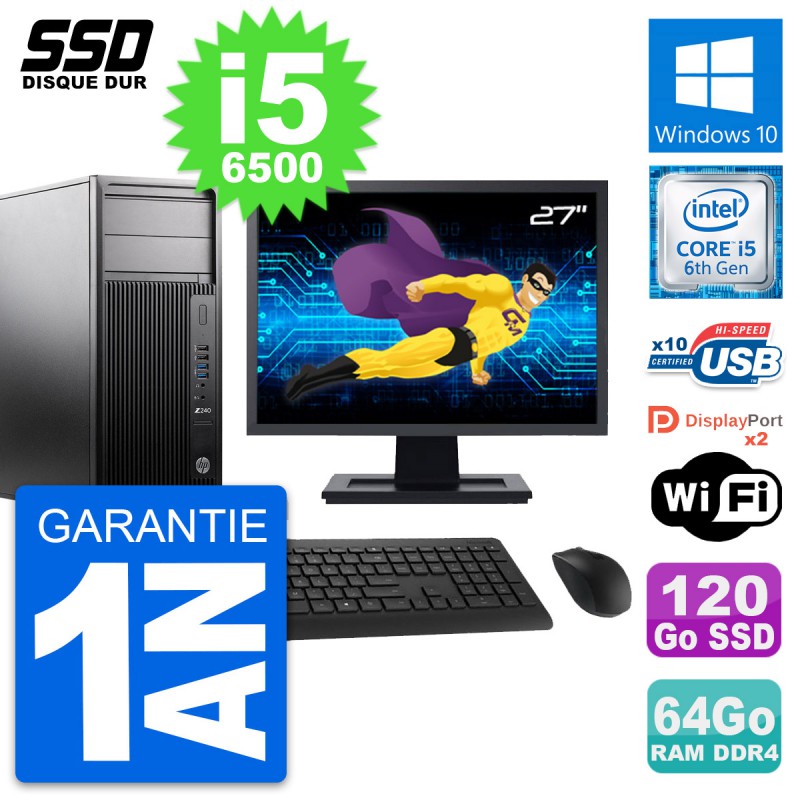 PC Tour HP WorkStation Z240 MT - Intel Core i5-6500 3.2 Ghz (6 Mo) - 64 Go DDR4 - SSD 120 Go - Clef Wifi USB - Windows 10 - Livré avec Ecran 27" + clavier + souris (Marques et modèles variables) - Garantie 1 an.