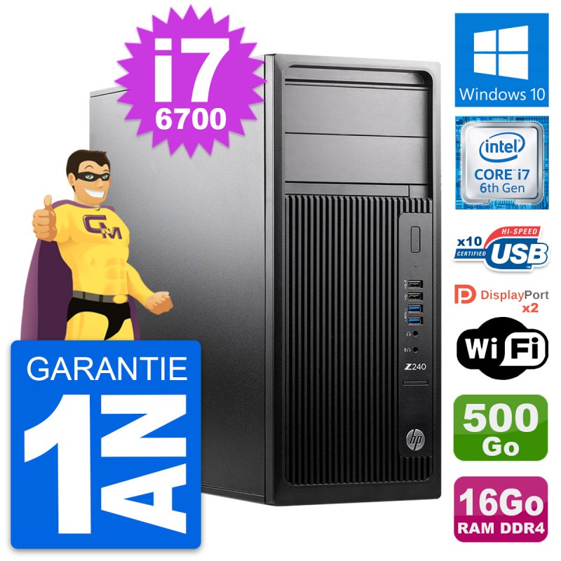PC Tour HP WorkStation Z240 MT - Intel Core i7-6700 3.4 Ghz (8 Mo) - 16 Go DDR4 - Disque Dur 3,5" 500 Go - Clef Wifi USB - Windows 10 - Garantie 1 an.