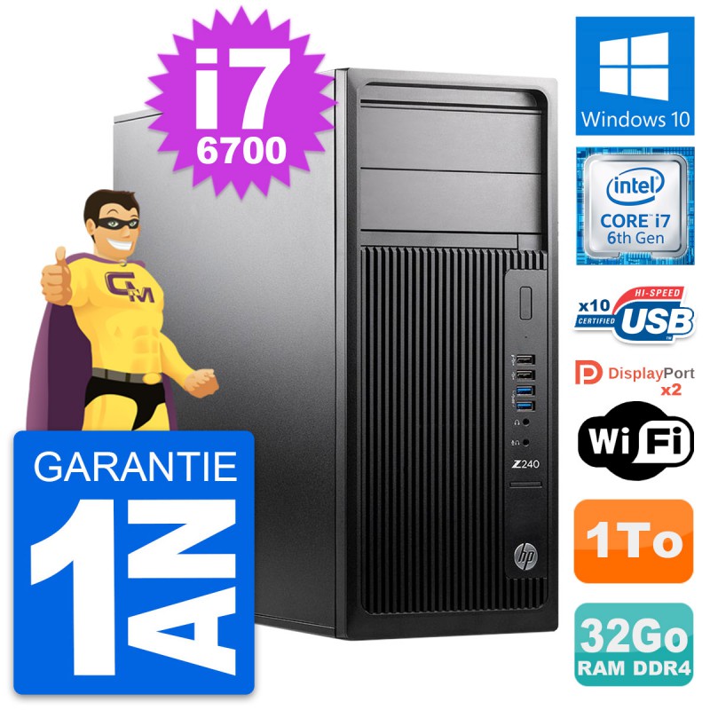 PC Tour HP WorkStation Z240 MT - Intel Core i7-6700 3.4 Ghz (8 Mo) - 32 Go DDR4 - Disque Dur 3,5" 1 To - Clef Wifi USB - Windows 10 - Garantie 1 an.