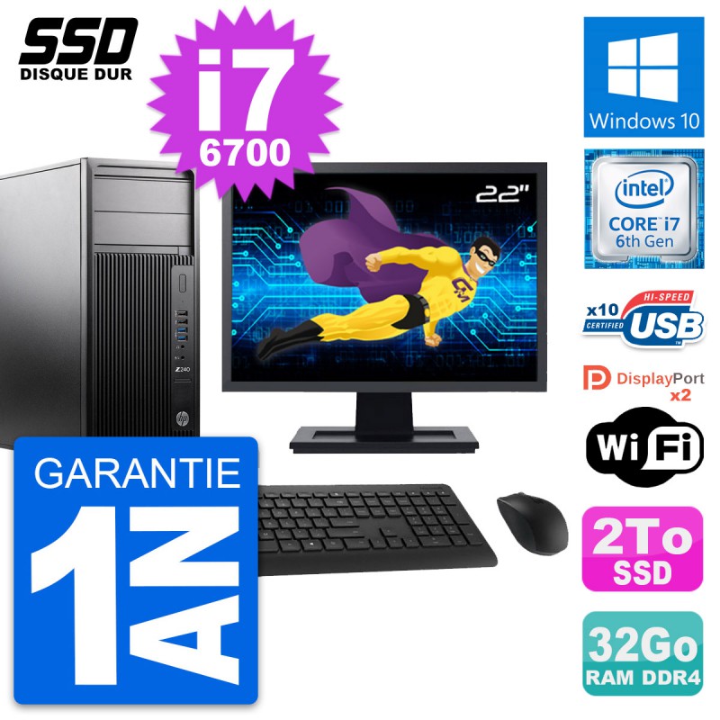 PC Tour HP WorkStation Z240 MT - Intel Core i7-6700 3.4 Ghz (8 Mo) - 32 Go DDR4 - SSD 2 To - Clef Wifi USB - Windows 10 - Livré avec Ecran 22" + clavier + souris (Marques et modèles variables) - Garantie 1 an.