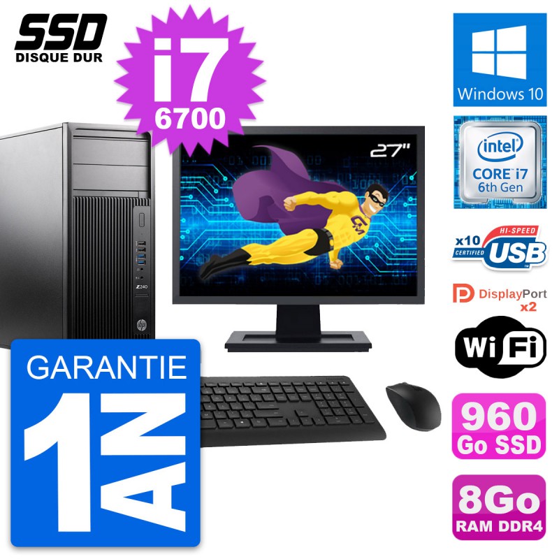 PC Tour HP WorkStation Z240 MT - Intel Core i7-6700 3.4 Ghz (8 Mo) - 8 Go DDR4 - SSD 960 Go - Clef Wifi USB - Windows 10 - Livré avec Ecran 27" + clavier + souris (Marques et modèles variables) - Garantie 1 an.